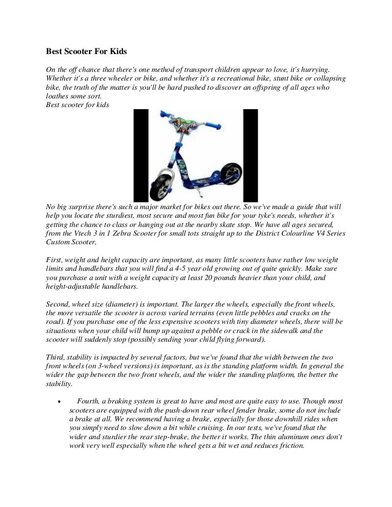 7 Best Scooters for Kids in 2021 (Guide & Reviews) With the help of some recruited kids, we put 7 scooters from top brands to test and concluded that Globber Primo 3-wheel, Micro Mini Deluxe, Razor A3, Fuzion Z300 Pro, Mongoose Expo 12″ Wheels, Micro Sprite, and Razor E300S Seated Electric Scooter are the best scooters for kids. 7 Best Scooters For Kids in 2021 - Updated List Our pick 10 Best Kids Scooters (2022 Reviews) - MomLovesBest Best Two-Wheel Scooter for Kids. This folding scooter is super lightweight and perfect for taking on the go to the park or other outdoor areas. The t-bar has three adjustable heights to allow the scooter to grow with your child. It's made from aluminum alloy and can accommodate children up to 143 pounds.