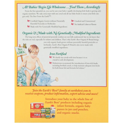 Organic Infant Rice Cereal - Iron Fortified | Earth's Best Earth's Best Organic® Infant Rice Cereal is a perfect first food for your little one as they transition to solids. Made from wholesome organic grains, this delicious iron fortified baby rice cereal contains no genetically engineered ingredients. Key Benefits Made with organic rice grains Iron fortified for infant growth and development